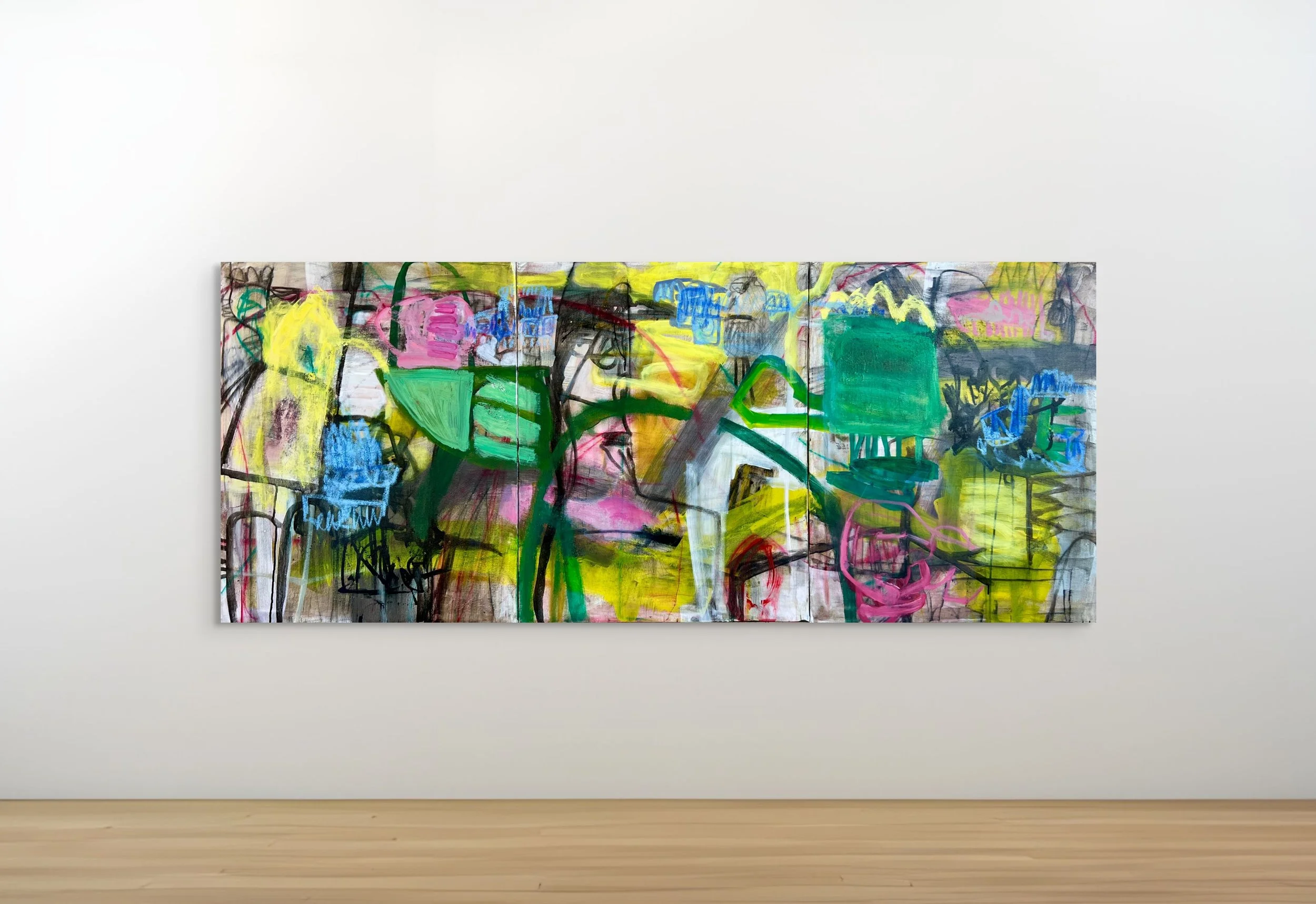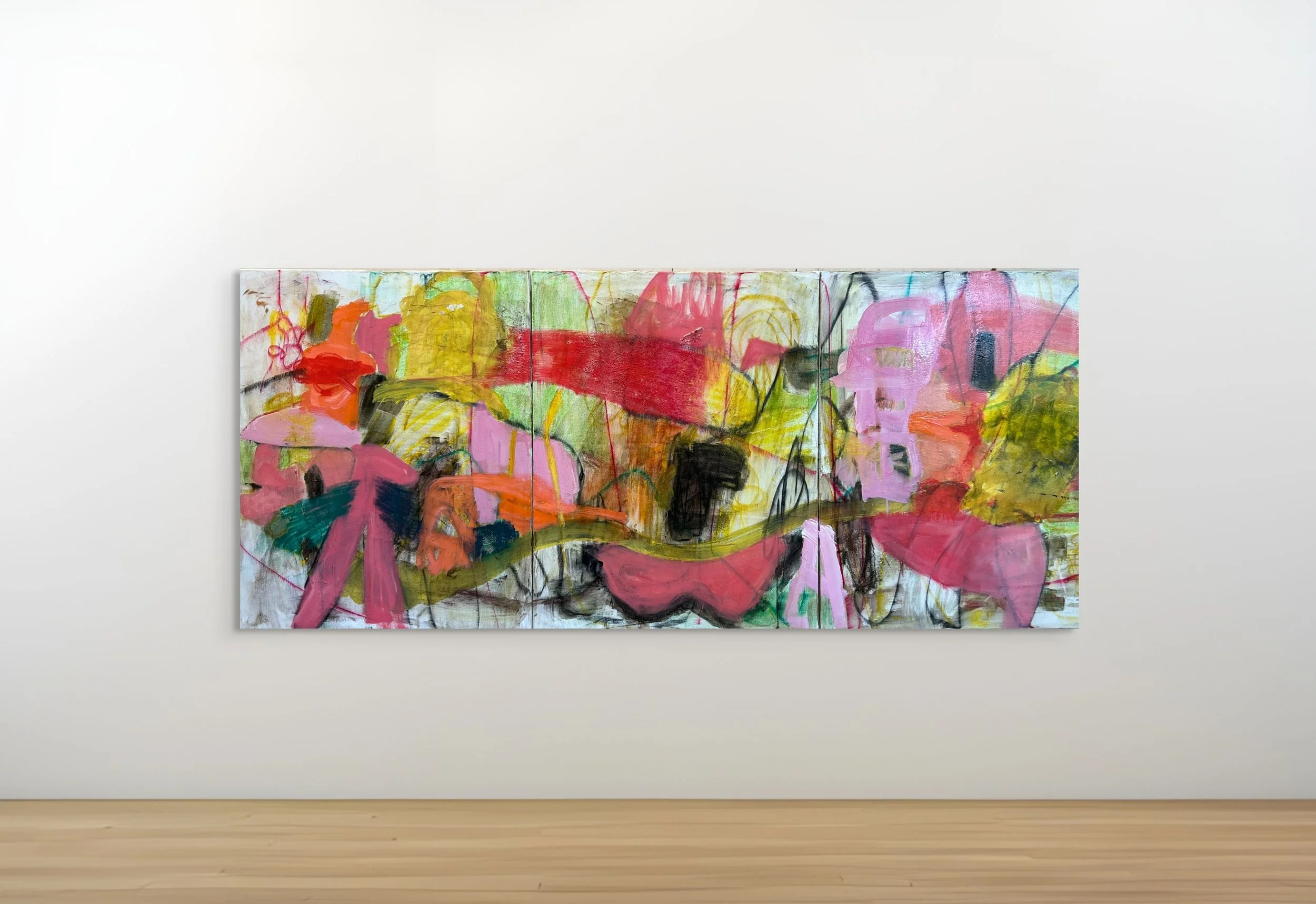 She’s Running Through It. 2025. Mixed media on canvas - Triptych 30” x 72”